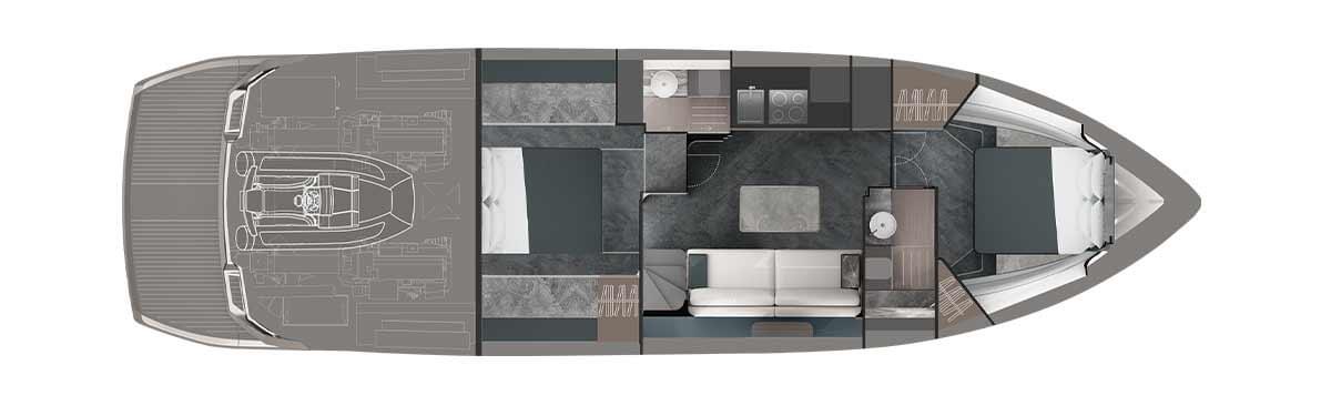 This all sits behind a double curved 5m2 windscreen with a stainless cap above for completely uninterrupted views. The new centre-line triple helm is a first for Sunseeker and delivers an open plan arrangement with easy, same level side deck access from pantograph sliding doors port and starboard, as well as internal access below deck via a companionway hatch on the starboard side. Steps lead down to a highly luxurious open plan lobby and galley area sat beneath LED lighting. Further recessed lighting, curved wood and lacquer finishes all contribute to the premium feel that truly delights those who step on board. The light floods through from the expansive screen above and electrically operated blinds allow intimacy and shade when needed. A TV is built in above the galley with the option to fall and rise to allow a transformation into a more relaxed seating area with comfortable lounging seats and a dedicated drinks cabinet behind. Forward is a VIP cabin with en-suite, upholstered side units and a wardrobe unit to port. There is a large bed and the interior comes with different styling palettes throughout to give a customised and personal feel to every owner. Aft is the Master cabin with sliding berths to generate either a double or two singles and generous en suite. Black lacquer panels frame this main cabin creating an ambiance that is pure indulgence.